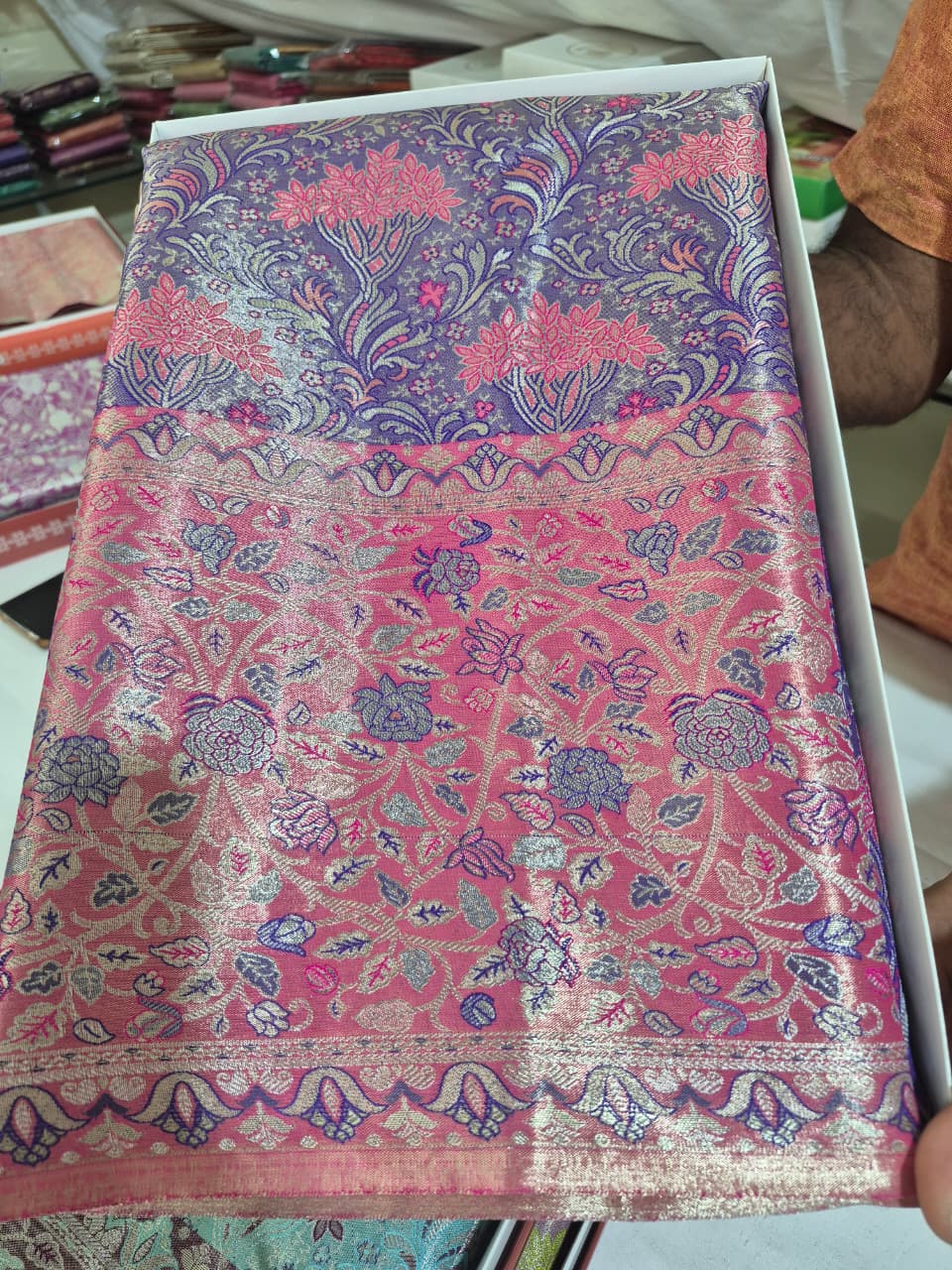 Elegant Purple Silk Saree with Floral Pink Border