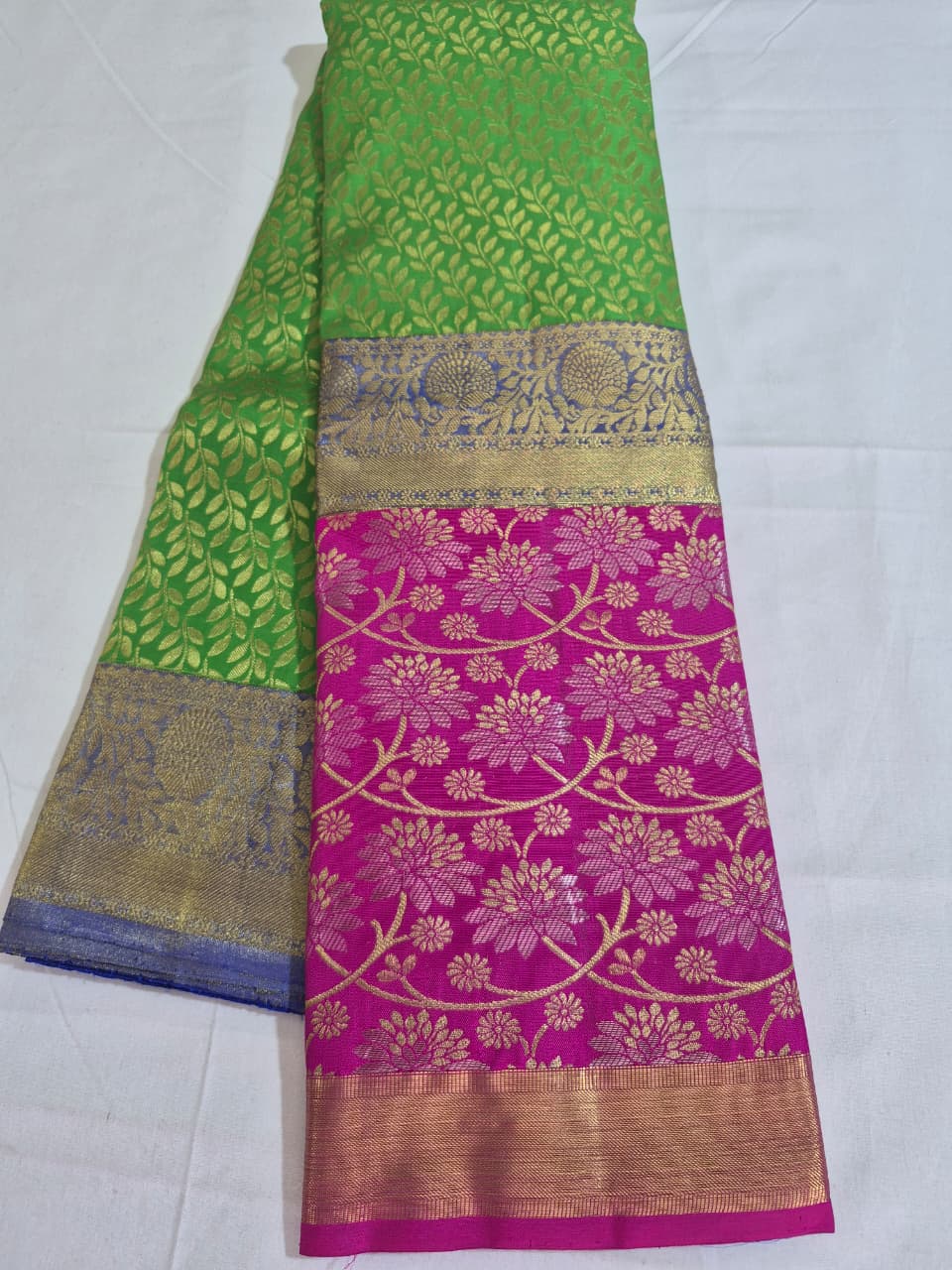 Elegant Parrot Green & Rani Pink Silk Saree with Contrast Zari Border