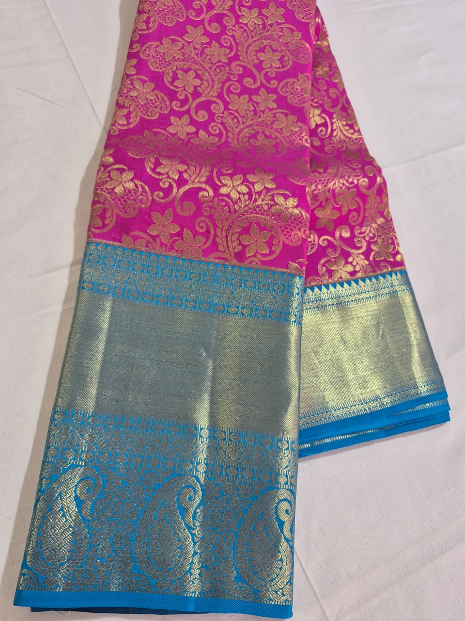 Make a bold and beautiful statement with this stunning rani pink silk saree, designed with intricate gold zari floral motifs across the body. The rich pink shade adds vibrancy and elegance, while the detailed weaving reflects traditional craftsmanship.