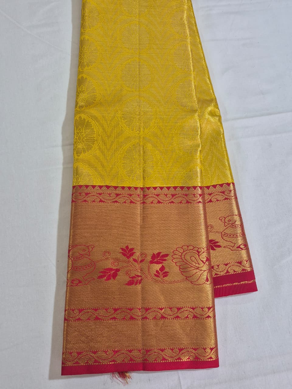 The highlight of this saree is its rich gold zari pallu, intricately woven with floral and traditional motifs that reflect fine craftsmanship. The red contrast border adds a bold touch, enhancing the overall beauty of the saree.