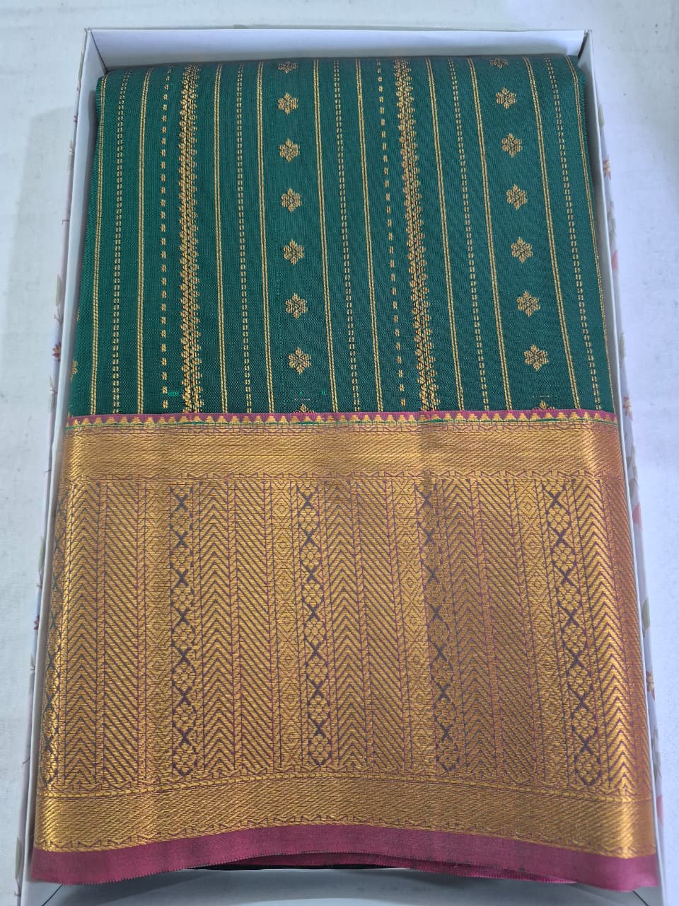 Add timeless elegance to your wardrobe with this beautifully crafted Green silk saree. Designed with a luxurious gold zari border and intricate woven patterns, this saree exudes grace and sophistication. The soft silk fabric drapes effortlessly, making it perfect for weddings, festive occasions, and traditional celebrations.